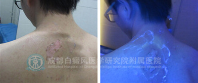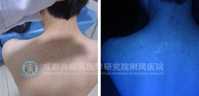 1、伍德灯检查:背部黑色素缺失严重,白斑明显,边缘模糊