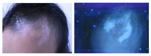 1、wood灯检查:头部、眼角、腹部不同程度色素脱失