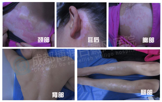 1、wood灯:头部、耳后白斑色素脱失约为80-100%;颈部、胸部、腹部、腿部、会阴部、双足、脚踝处白斑色素脱失约为100%;其它部位白斑色素脱失约为70-85%。