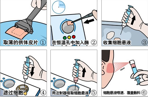 Recell分离治疗的核心技术便是黑素细胞体外再生,与以往的自体表皮移植方法所不同的是,该方法避开了治疗后色素范围扩大现象不明显或过于明显的状况,也突破了自体表皮移植方法一次性治疗面积受限、面积较大的需多次治疗的局限。黑色素细胞自体体外再生便是首先从患者正常皮肤取一片薄的皮片,用Recell一次性独立自体细胞搜集器制成的活细胞悬液培养,促成黑素细胞体外再生,从而“上喷”在创面,从而达到黑素细胞的恢复,迅速使皮肤的正常色素沉着,使得白癜风康复的几率大大增强。