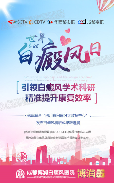 正值6.25世界白癜风日之际,我国作为白癜风的发病重点国家之一,有着近2000万发病人群。因此,每年此时都会呼吁大家关注白癜风患者,拒绝冷漠,消除歧视,传递爱心。我院也将联合四川省白癜风大数据,发布白癜风科研成果新进展,召开“毛囊外根鞘细胞混悬液(NCORSHFS)移植技术临床应用暨肢端型白癜风外科诊疗新进展学术报告媒体发布会”,推广白癜风精细化诊疗,精准提升白癜风康复效率!