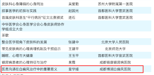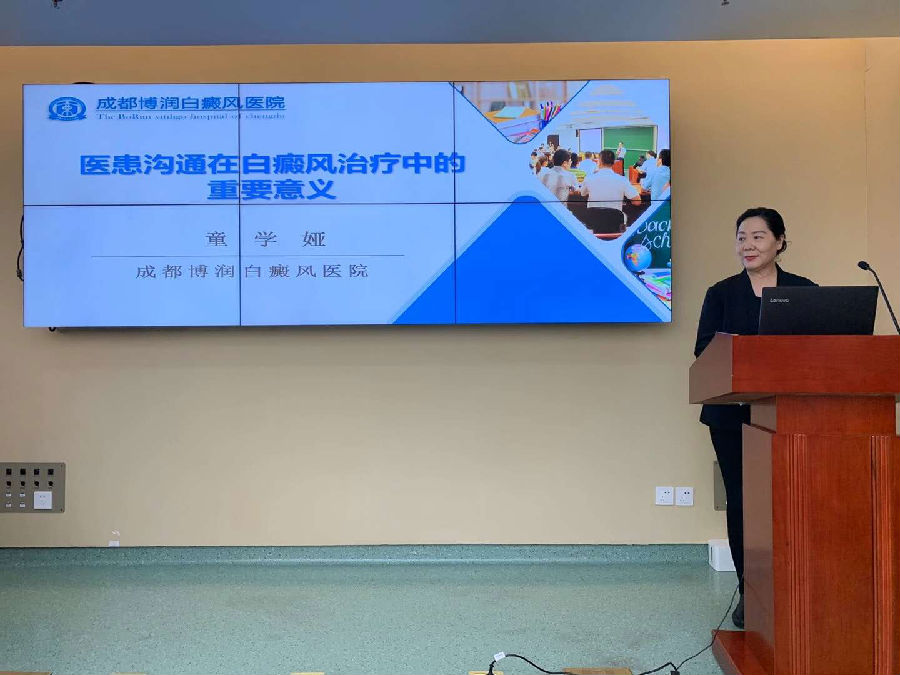 成都博润白癜风医生童学娅主任代表医院出席会议,并在大会上作《医患沟通在白癜风治疗中的重要意义》学术报告,提出“先尊重病人权益、后斟酌病人的治疗”观点得到与会医生的高度认可和广泛热议。
