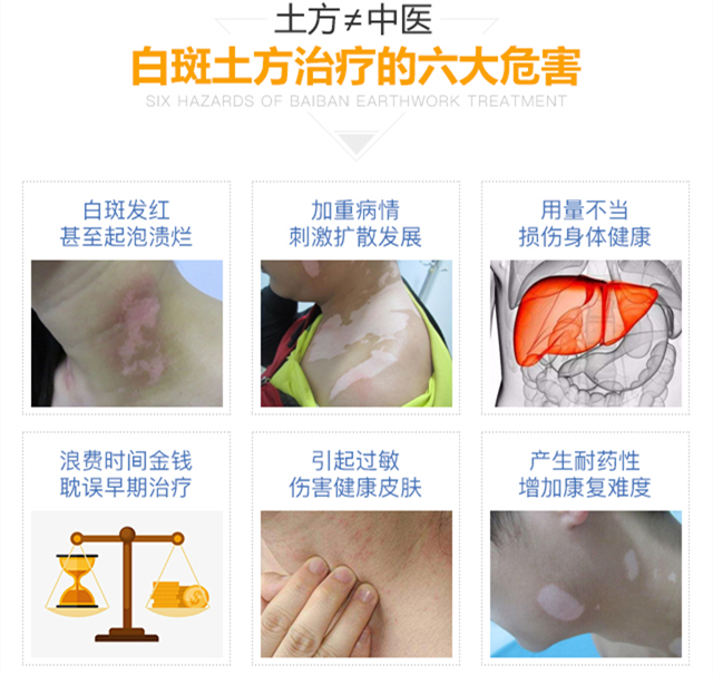 偏方、土方、外搽药、激素药使广大患者深受其害,据统计观察:使用偏方、土方、外搽药治疗,到达临床康复标准的患者为“0”、67.2%治疗三个月以上的患者皮肤患处产生一定程度的炎症、超过六个月,部分出现耐药性和抗药性,超过一年以上的大多数患者病情复发、加重、白斑泛发。