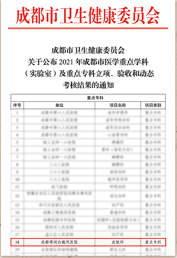 2021年7月5日,成都市卫健委依据《成都市医学重点学科及重点专科管理办法》遴选出成都市医学重点学科、重点专科建设项目,成都博润白癜风医院被评为“成都市皮肤科重点专科"建设项目。据悉,成都博润是目前为止,全国首家当选重点专科建设单位的白癜风专病医院。